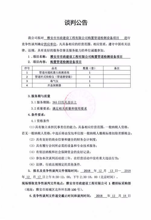 市政公司購置管道檢測(cè)設(shè)備項(xiàng)目的競(jìng)爭性談判公告