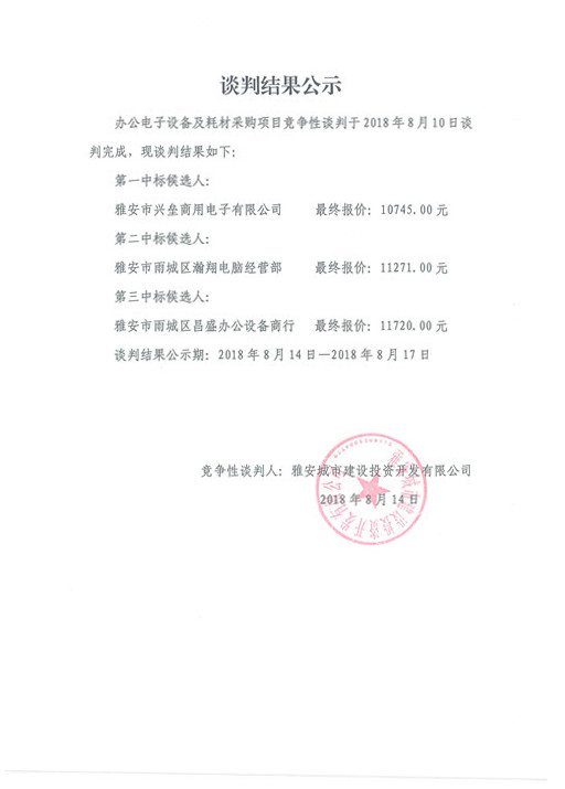 雅安城市建設(shè)投資開發(fā)有限公司辦公電子設(shè)備及耗材采購項(xiàng)目——競(jìng)爭(zhēng)性談判結(jié)果公示