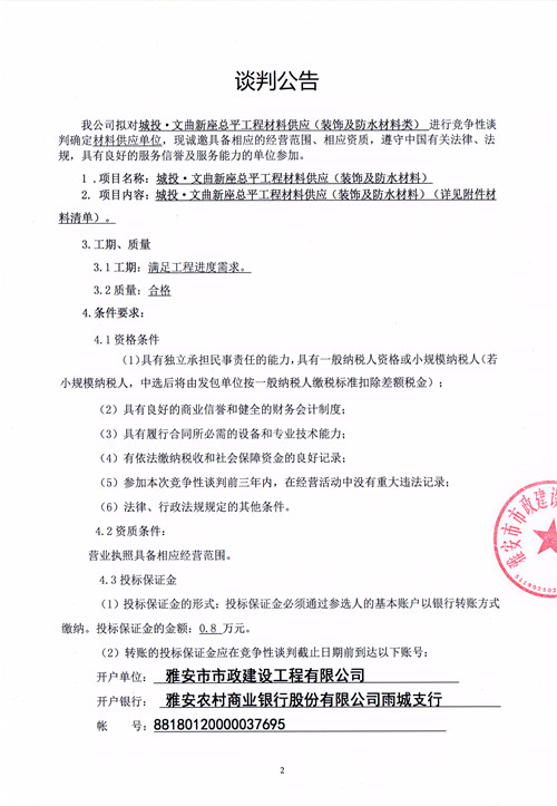 城投·文曲新座總平工程材料供應(yīng)(裝飾及防水材料類)競爭性談判公告