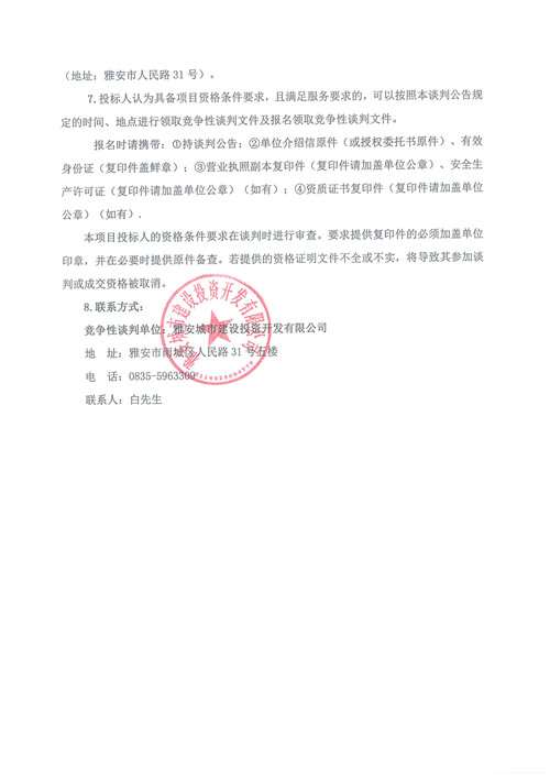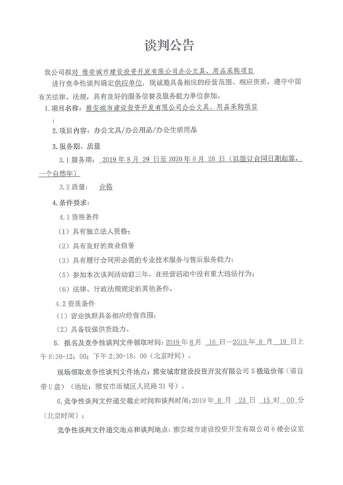 雅安城市建設投資開發(fā)有限公司辦公文具、用品采購項目競爭性談判公告