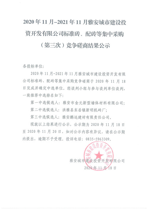 2020年11月-2021年11月雅安城市建設(shè)投資開發(fā)有限公司標(biāo)準(zhǔn)磚、配磚等集中采購(第三次)競(jìng)爭(zhēng)磋商結(jié)果公示