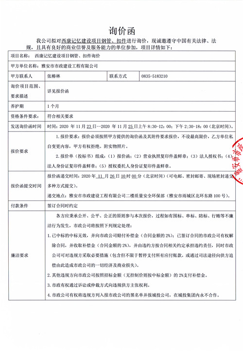 市政公司西康記憶建設(shè)項目鋼管、扣件詢價函