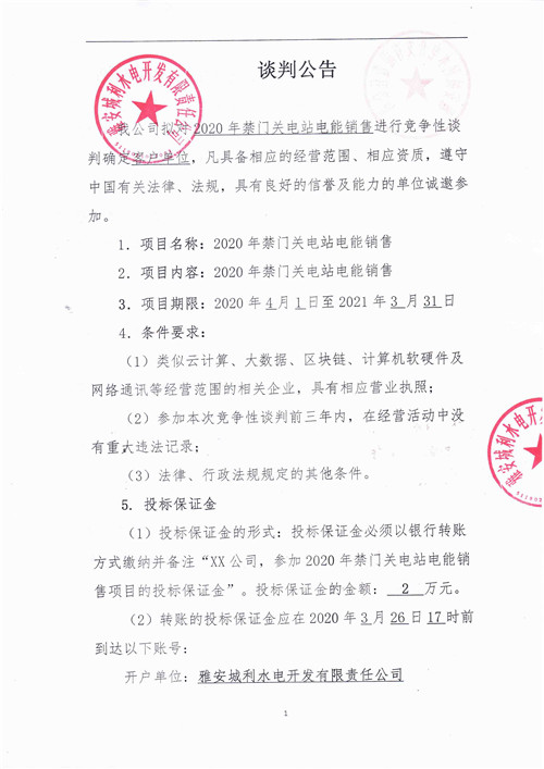 城利水電公司2020年禁門關(guān)電站電能銷售競爭性談判公告
