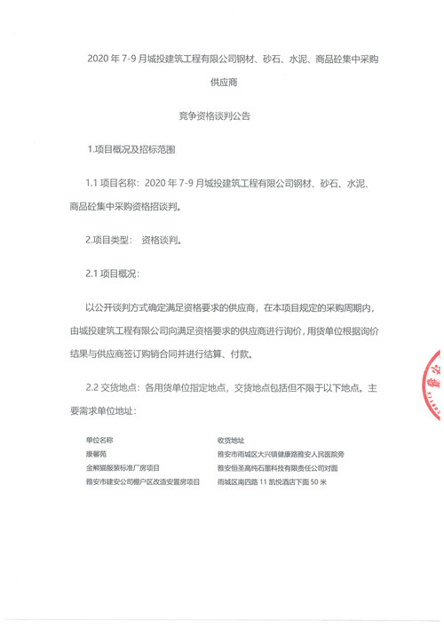 2020年7月-9月城投建筑工程有限公司鋼材、砂石、水泥、商品砼集中采購供應(yīng)商競爭性資格談判公告