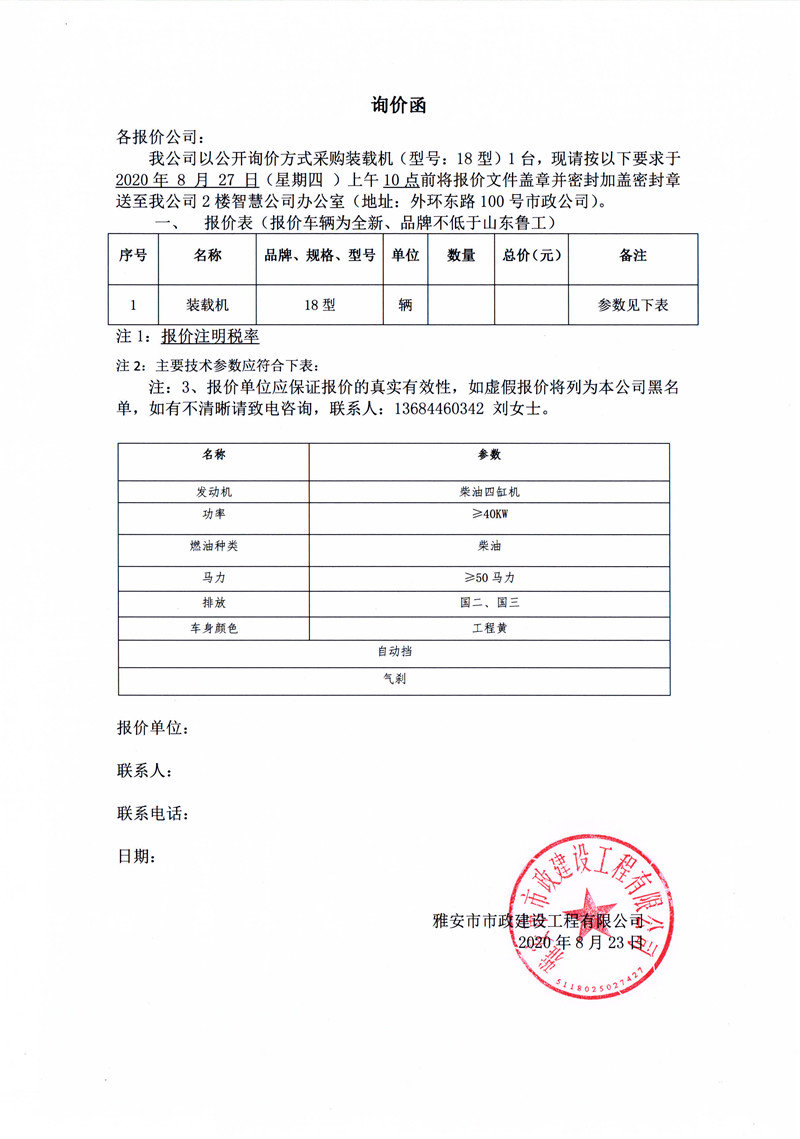 雅安市市政建設(shè)工程有限公司采購裝載機(型號:18型)詢價函