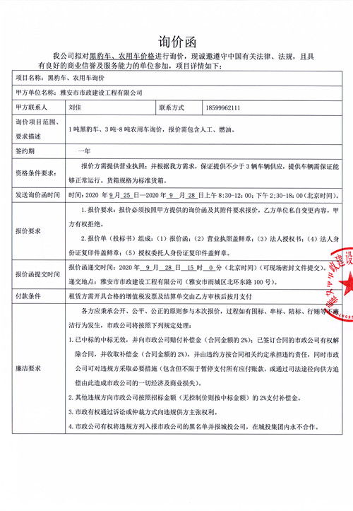 詢價(jià)函(黑豹車、農(nóng)用車、雙橋車租賃)