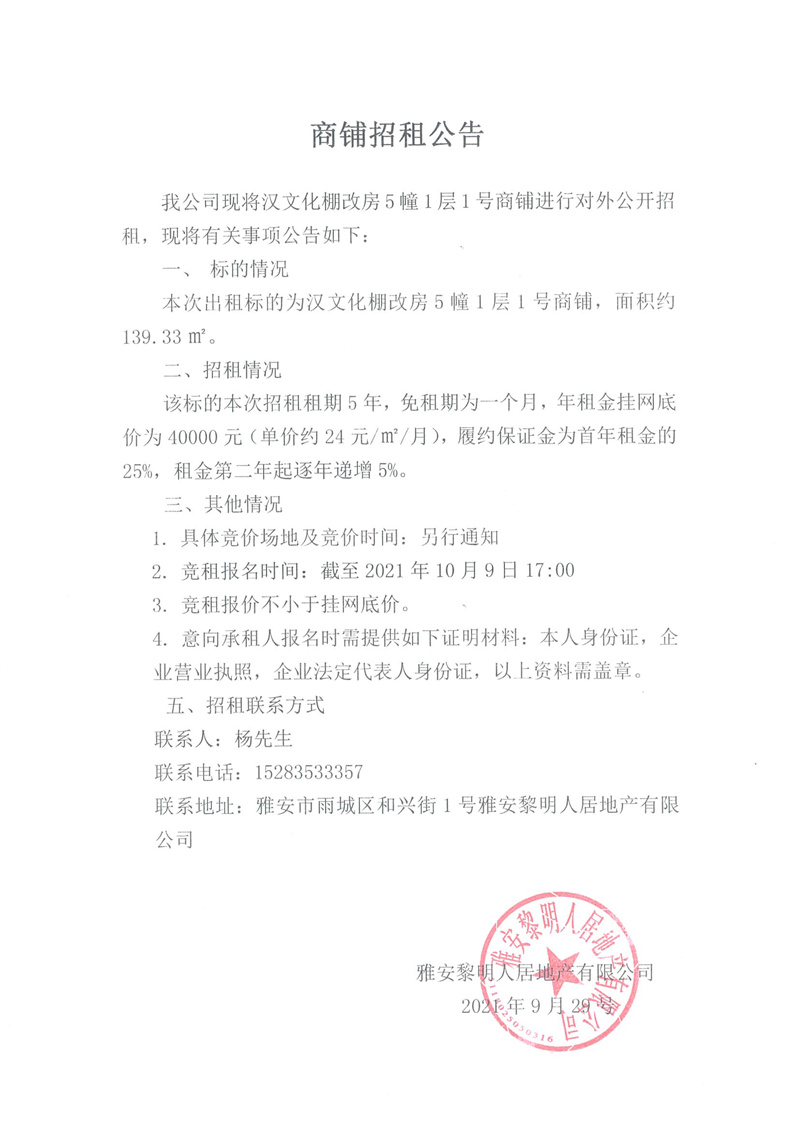 漢文化棚改房5幢1層1號商鋪招租公告