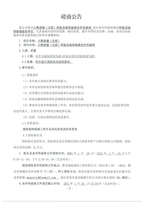 雅安城投建筑工程有限公司大興壹號(北苑)樣板房裝飾裝修競爭性磋商公告