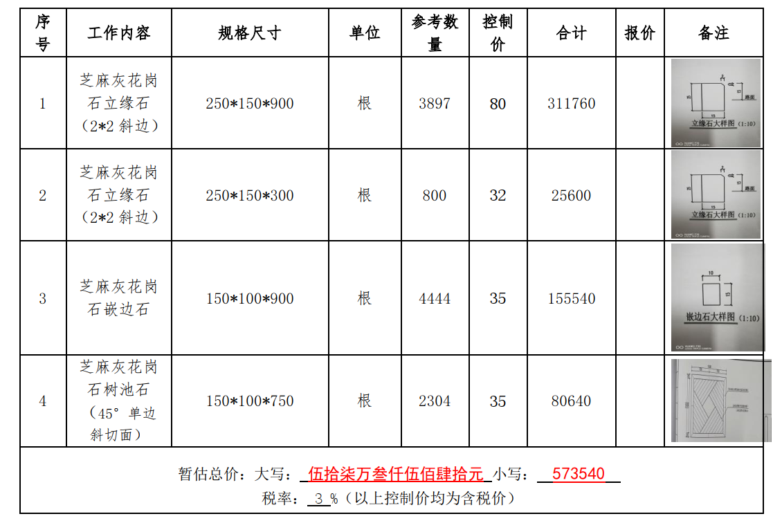 2、報(bào)價(jià)單位需提供250*150*300芝麻灰花崗石樣品,樣品在開(kāi)標(biāo)之前送達(dá)。