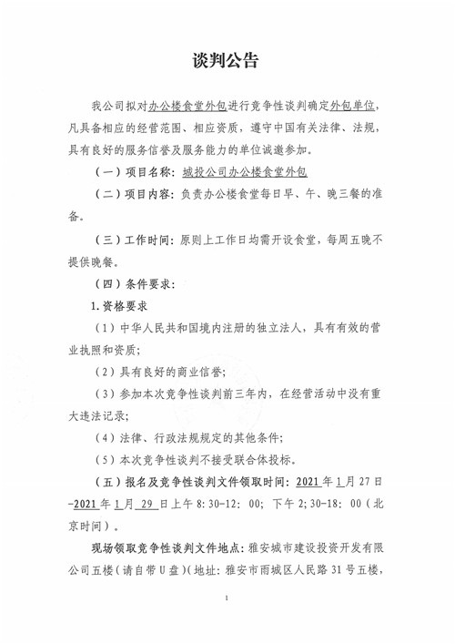 雅安城市建設(shè)投資開(kāi)發(fā)有限公司辦公樓食堂外包競(jìng)爭(zhēng)性談判公告