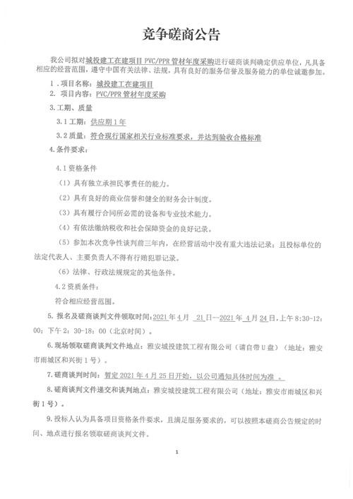 城投建工在建項目PVC/PPR管材年度采購磋商公告