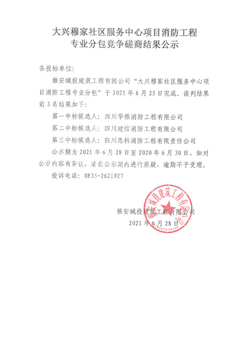城投建工公司大興穆家社區(qū)服務中心項目消防工程專業(yè)分包競爭性磋商結果公示