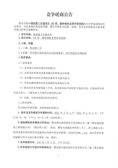 城投建工公司在建項目JDG管、鍍鋅鋼材及管件等采購競爭性磋商公告(第二次)