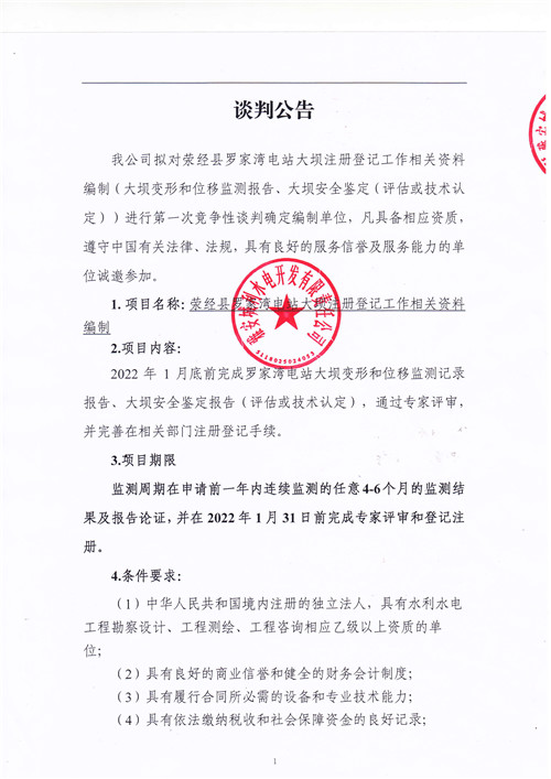 城利水電公司滎經(jīng)縣羅家灣電站大壩注冊登記工作相關資料編制競爭性談判公告