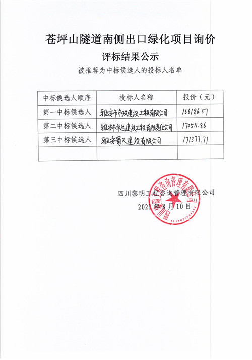 黎明咨詢公司蒼坪山隧道南側出口綠化項目詢價評標結果公示