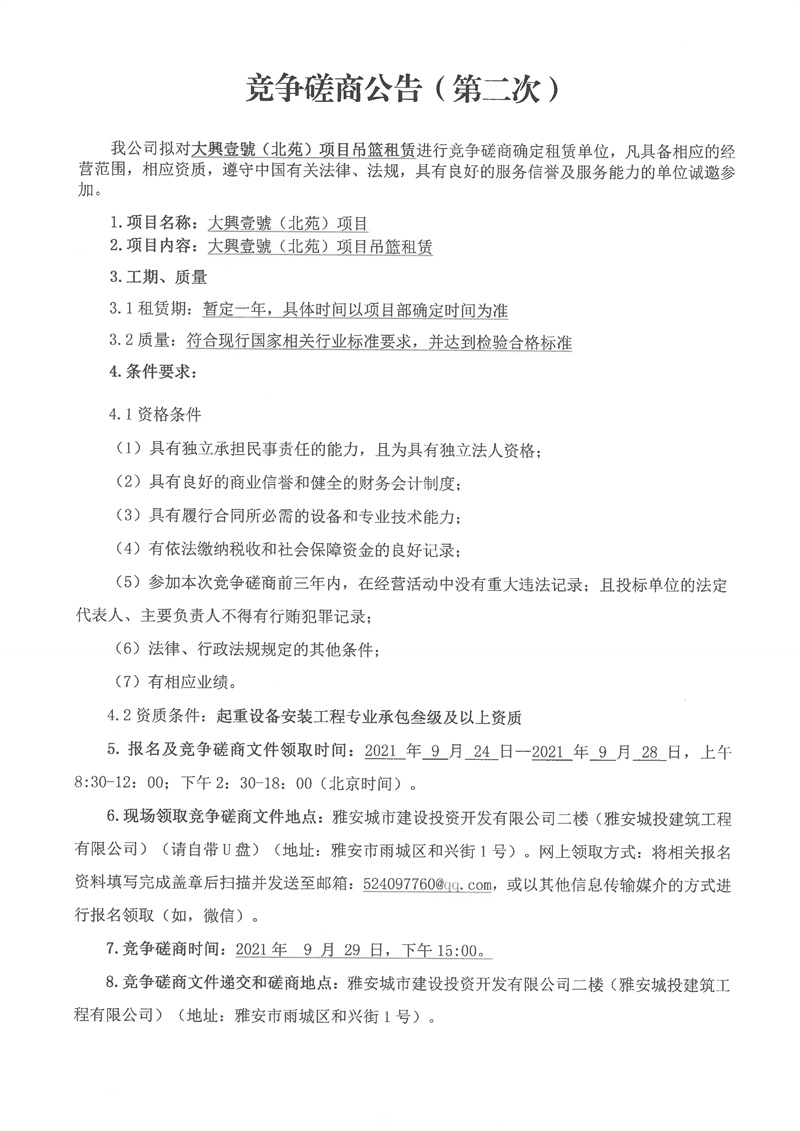 大興壹號(北苑)項(xiàng)目吊籃租賃競爭性磋商(第二次)公告
