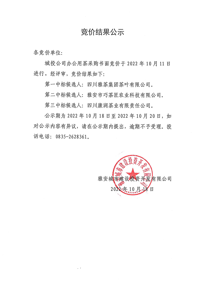 城投公司辦公用茶競價結(jié)果公示