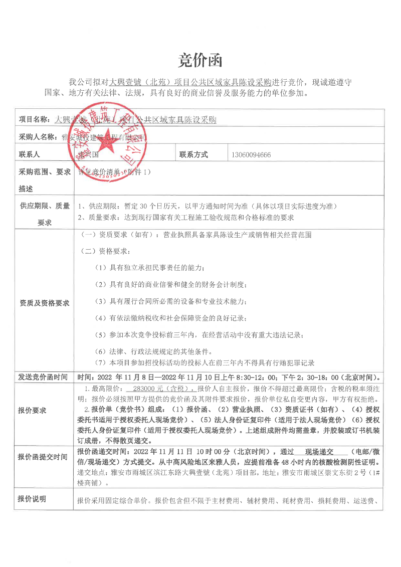 大興壹號(hào)(北苑)項(xiàng)目公共區(qū)域家具陳設(shè)采購(gòu)競(jìng)價(jià)函