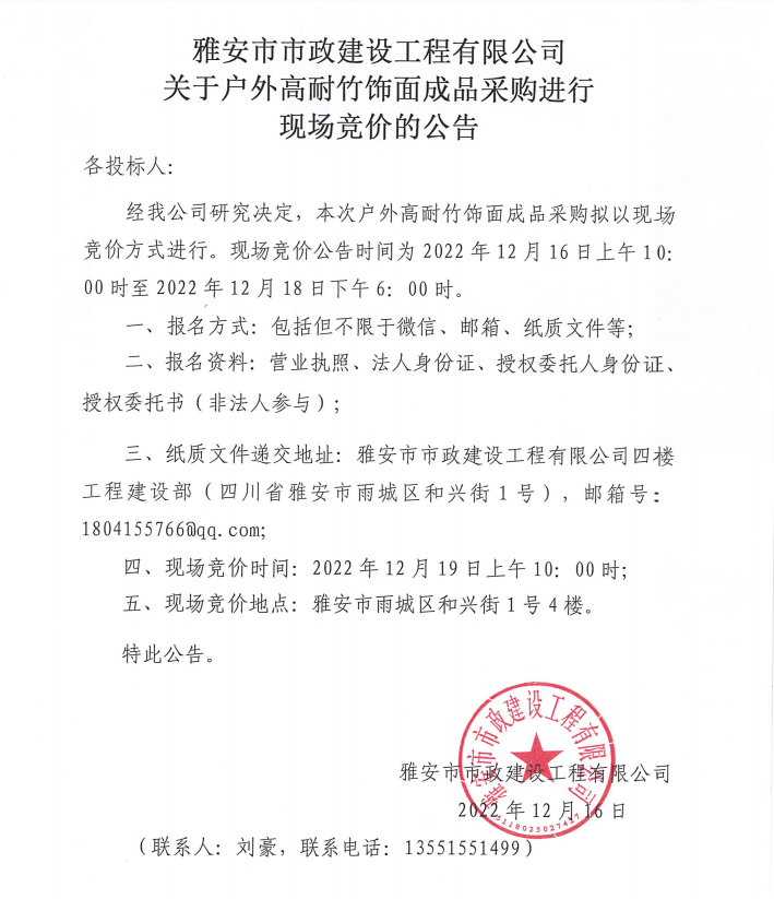 雅安市市政建設工程有限公司關(guān)于戶外高耐竹飾面成品采購進行現(xiàn)場競價公告