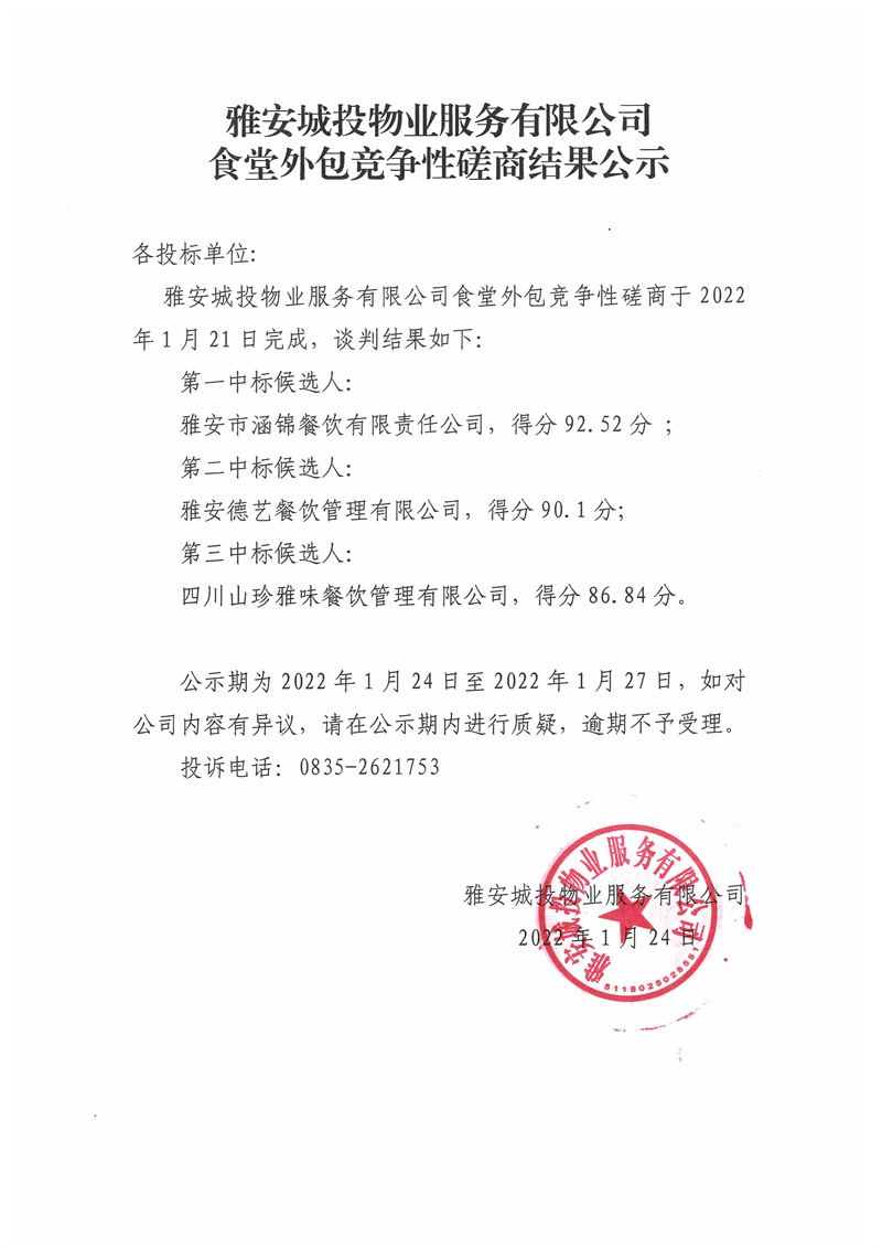 雅安城投物業(yè)服務有限公司食堂外包競爭性磋商結果公告