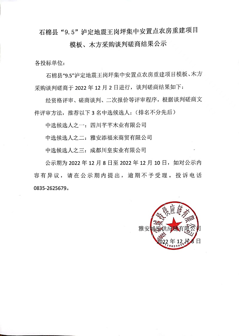 石棉縣“9.5”瀘定地震王崗坪集中安置點(diǎn)農(nóng)房重建項目模板、木方采購談判磋商結(jié)果公示