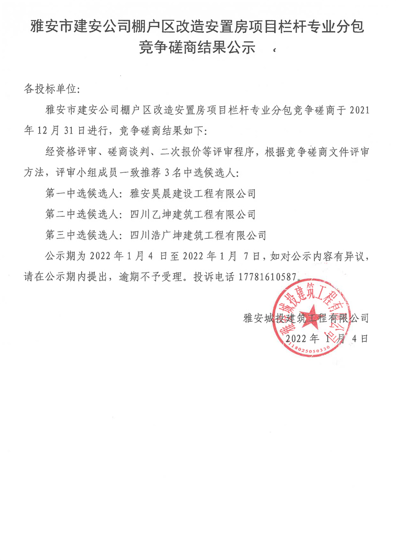 雅安市建安公司棚戶區(qū)改造安置房項目欄桿專業(yè)分包競爭磋商結果公示
