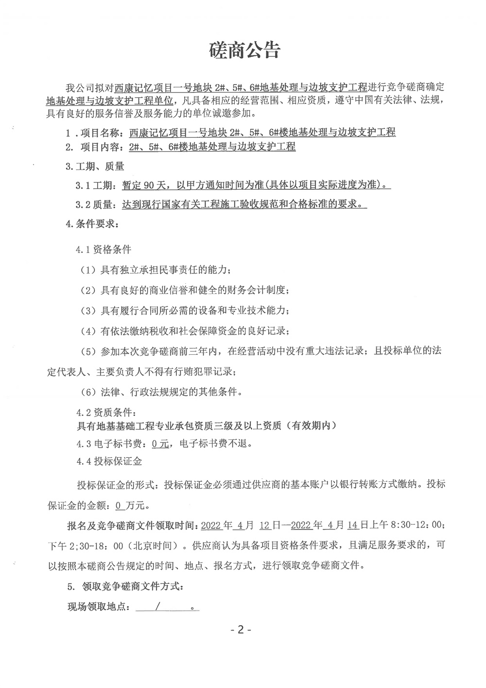 西康記憶項目一號地塊2#、5#、6#地基處理與邊坡支護(hù)工程磋商公告