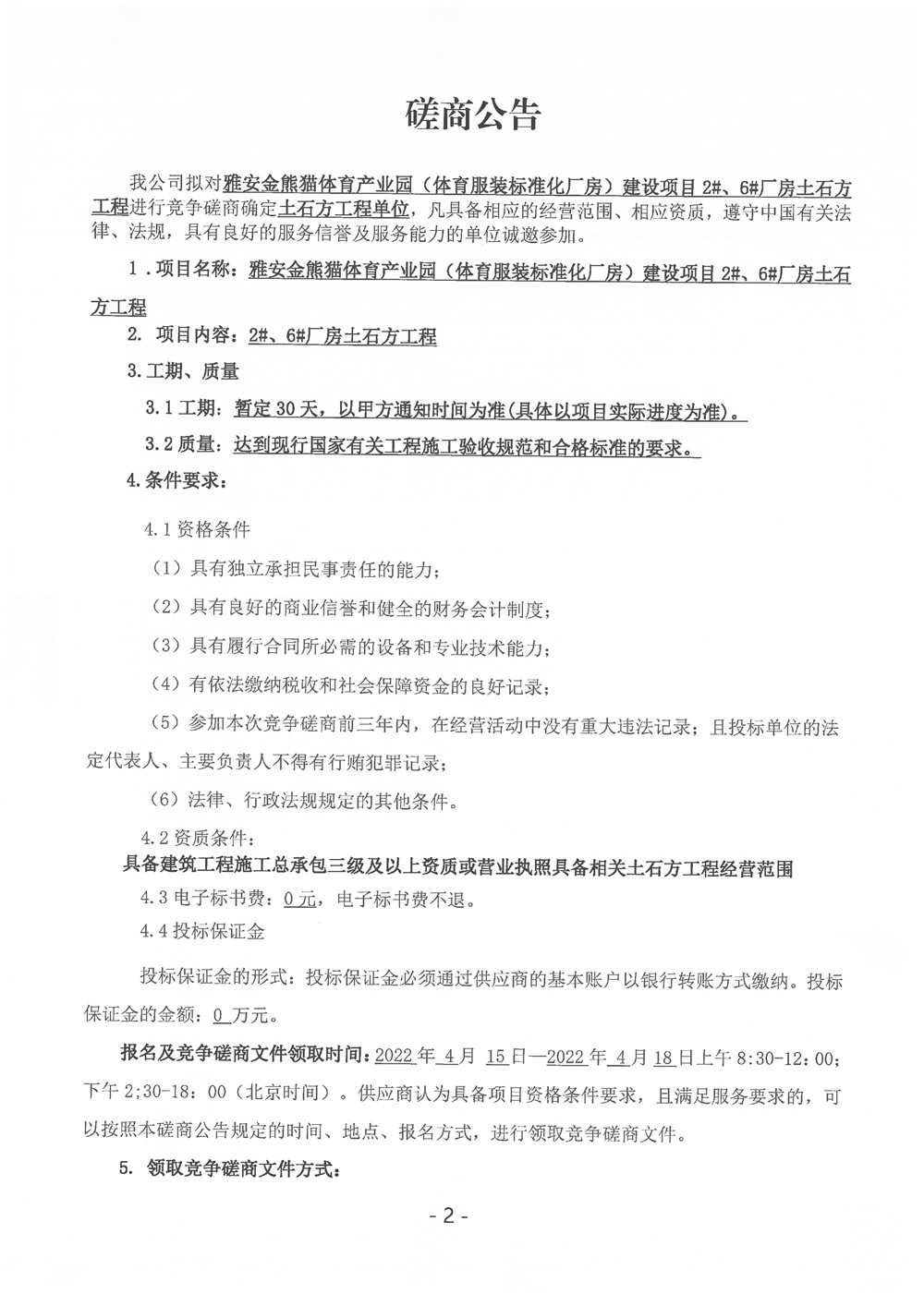 雅安金熊貓體育產(chǎn)業(yè)園(體育服裝標準化廠房)建設(shè)項目2#、6#廠房土石方工程磋商公告