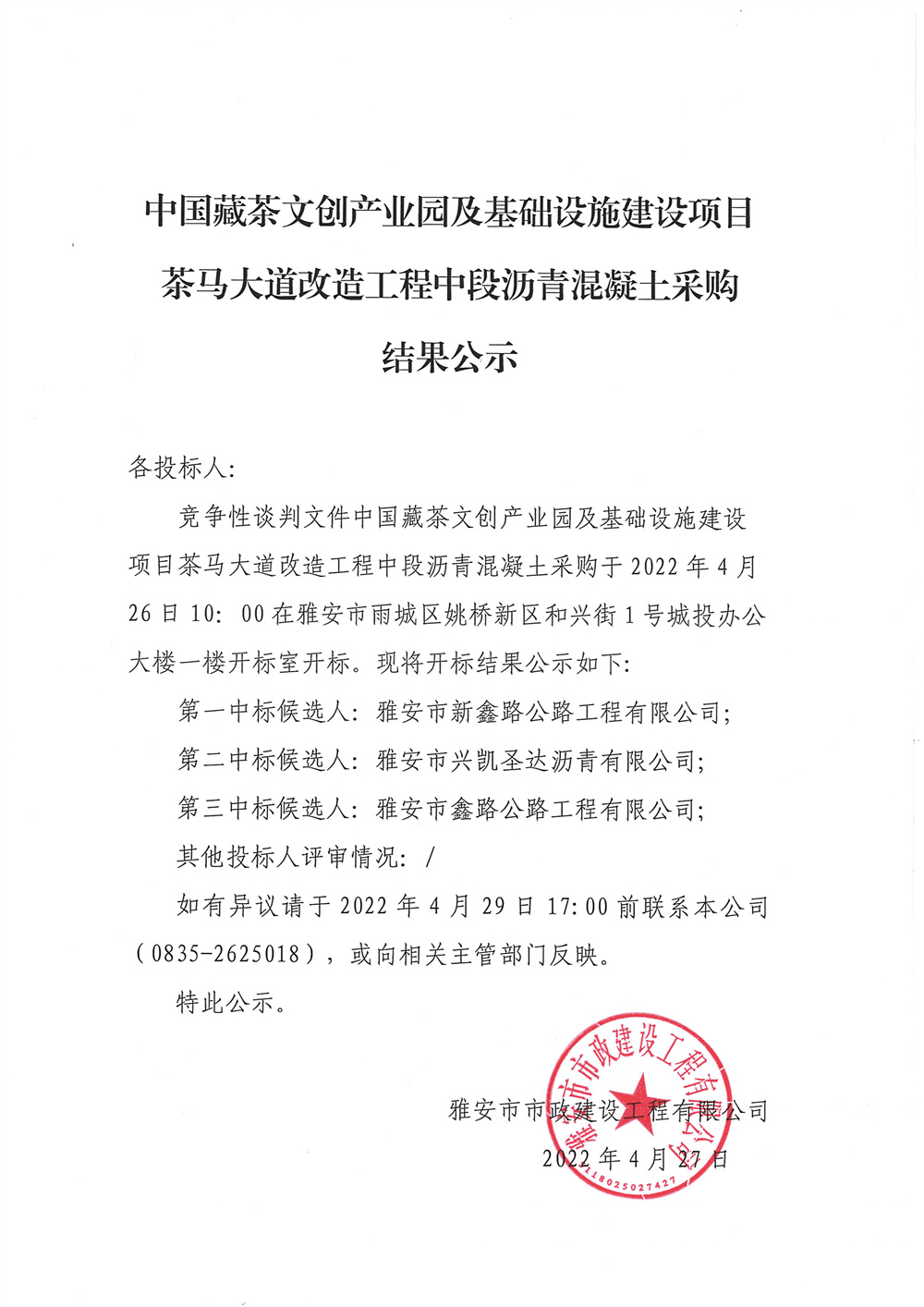中國藏茶文創(chuàng)產(chǎn)業(yè)園及基礎(chǔ)設(shè)施建設(shè)項目茶馬大道改造工程中段瀝青采購競爭性談判結(jié)果公示