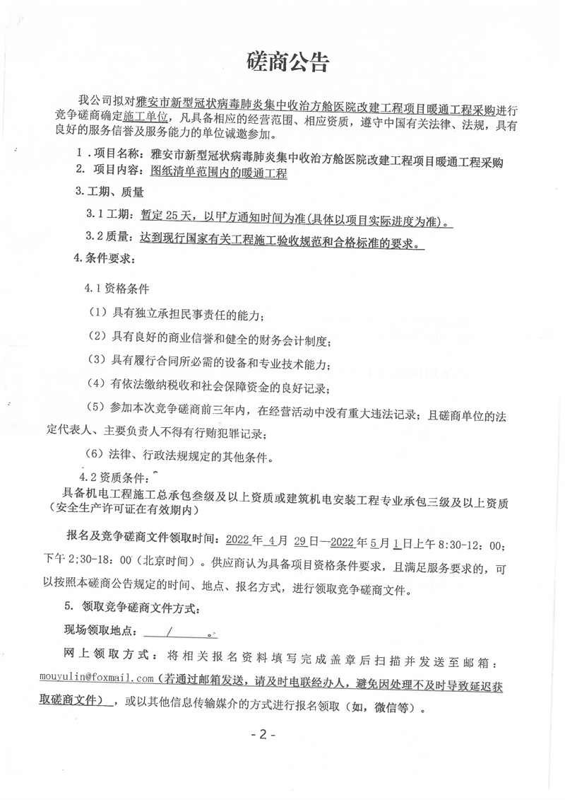 雅安市新型冠狀病毒肺炎集中收治方艙醫(yī)院改建工程項目暖通工程談判磋商公告