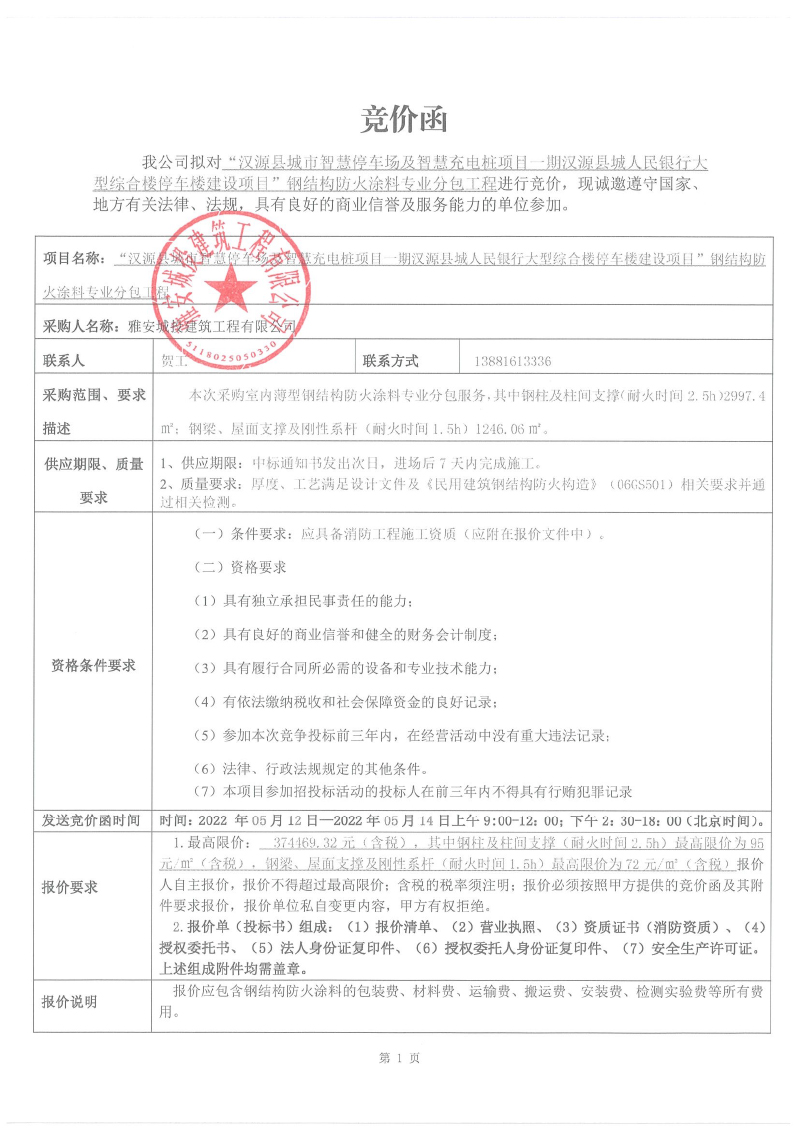 漢源縣城市智慧停車場(chǎng)及智慧充電樁項(xiàng)目一期漢源縣城人民銀行大型綜合樓停車樓建設(shè)項(xiàng)目防火涂料專業(yè)分包競價(jià)采購公告