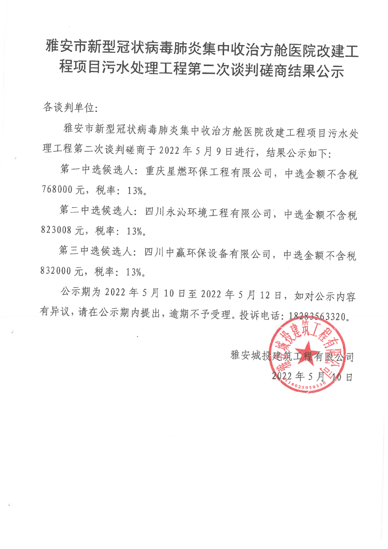 雅安市新型冠狀病毒肺炎集中收治方艙醫(yī)院改建工程項(xiàng)目污水處理工程第二次談判磋商結(jié)果公示