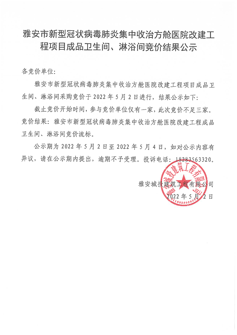 雅安市新型冠狀病毒肺炎集中收治方艙醫(yī)院改建工程項(xiàng)目成品衛(wèi)生間、淋浴間競價(jià)結(jié)果公示