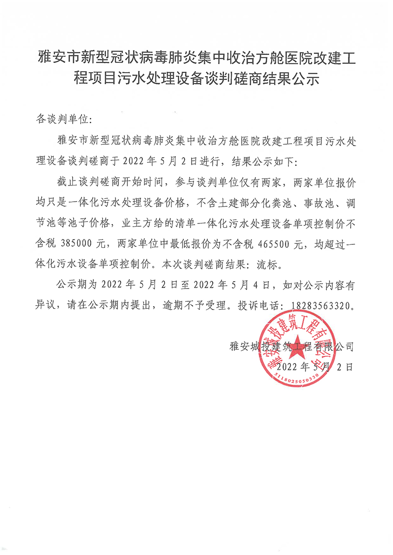 雅安市新型冠狀病毒肺炎集中收治方艙醫(yī)院改建工程項目污水處理設(shè)備談判磋商結(jié)果公示