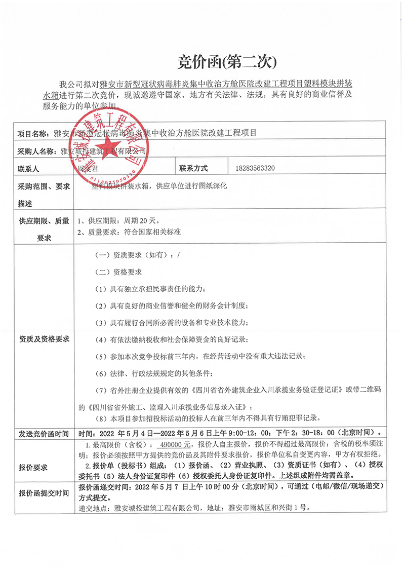 雅安市新型冠狀病毒肺炎集中收治方艙醫(yī)院改建工程項(xiàng)目塑料模塊拼裝水箱競(jìng)價(jià)函(第二次)