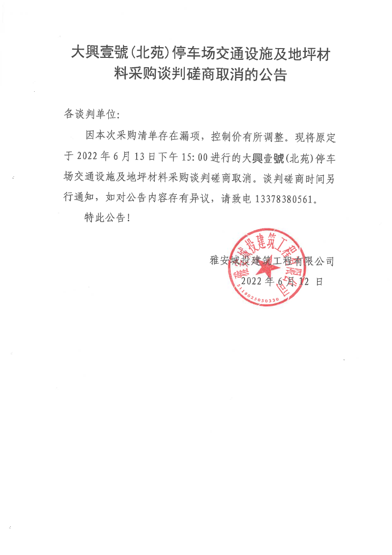 大興壹號(hào)(北苑)停車(chē)場(chǎng)交通設(shè)施及地坪材料采購(gòu)談判磋商取消的公告