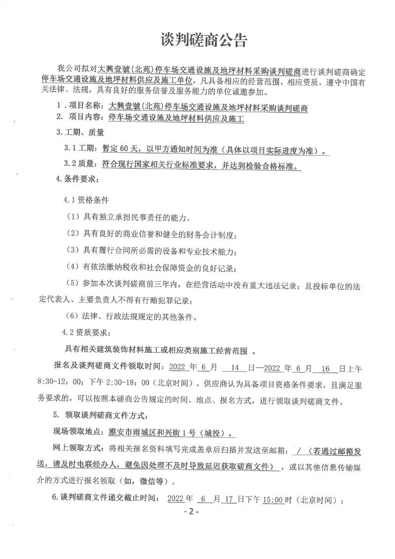 大興壹號(hào)(北苑)停車(chē)場(chǎng)交通設(shè)施及地坪材料采購(gòu)談判磋商公告