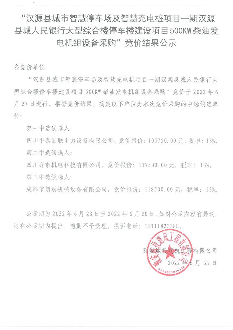 漢源縣城市智慧停車場及智慧充電樁項(xiàng)目一期漢源縣城人民銀行大型綜合樓停車樓建設(shè)項(xiàng)目500kw柴油發(fā)電機(jī)組設(shè)備采購競價(jià)結(jié)果公告