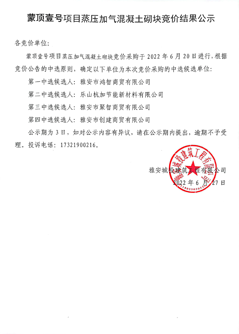 蒙頂壹號項目蒸壓加氣混凝土砌塊采購內(nèi)容競價結(jié)果公示