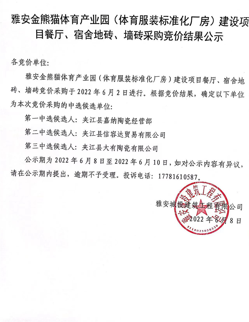 雅安金熊貓?bào)w育產(chǎn)業(yè)園(體育服裝標(biāo)準(zhǔn)化廠房)建設(shè)項(xiàng)目餐廳、宿舍地磚、墻磚競價(jià)結(jié)果公示
