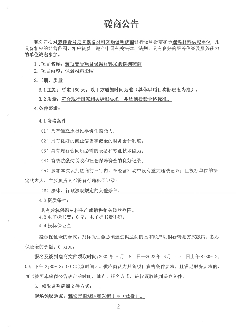 蒙頂壹號項目保溫材料采購談判磋商公告
