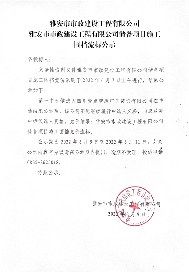 雅安市市政建設(shè)工程有限公司儲備項目施工圍擋流標(biāo)公示
