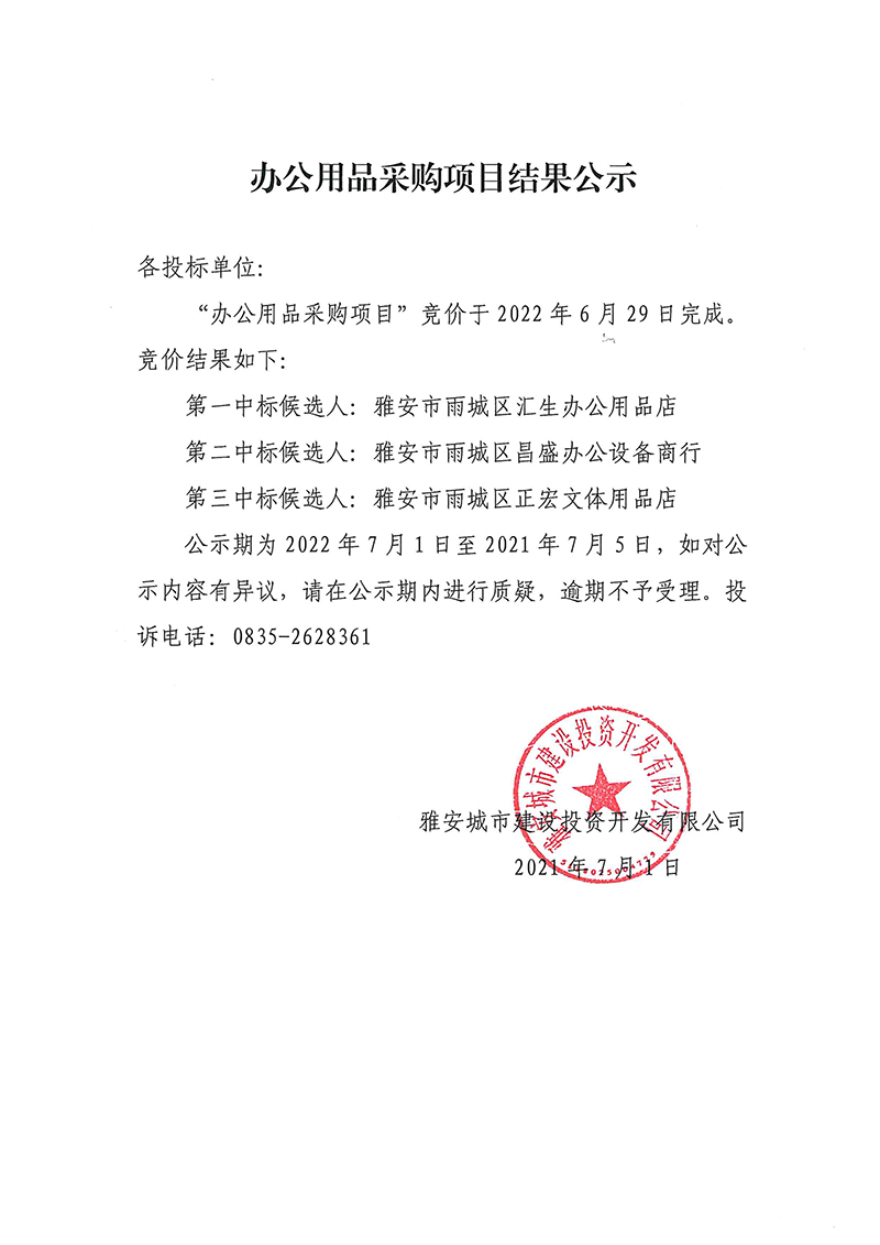 雅安城市建設(shè)投資開發(fā)有限公司辦公用品采購項(xiàng)目競(jìng)價(jià)結(jié)果公示