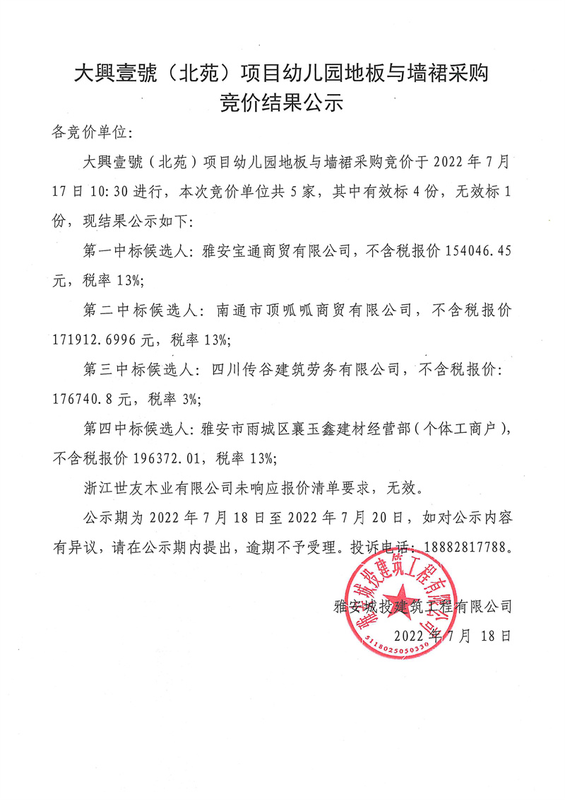 大興壹號(北苑)項目幼兒園地板與墻裙競價結果公示