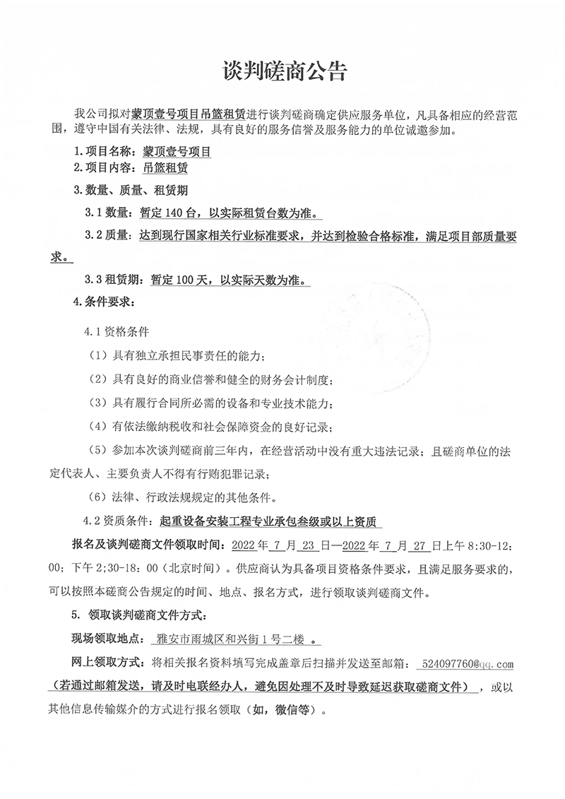 蒙頂壹號項(xiàng)目吊籃租賃談判磋商公告