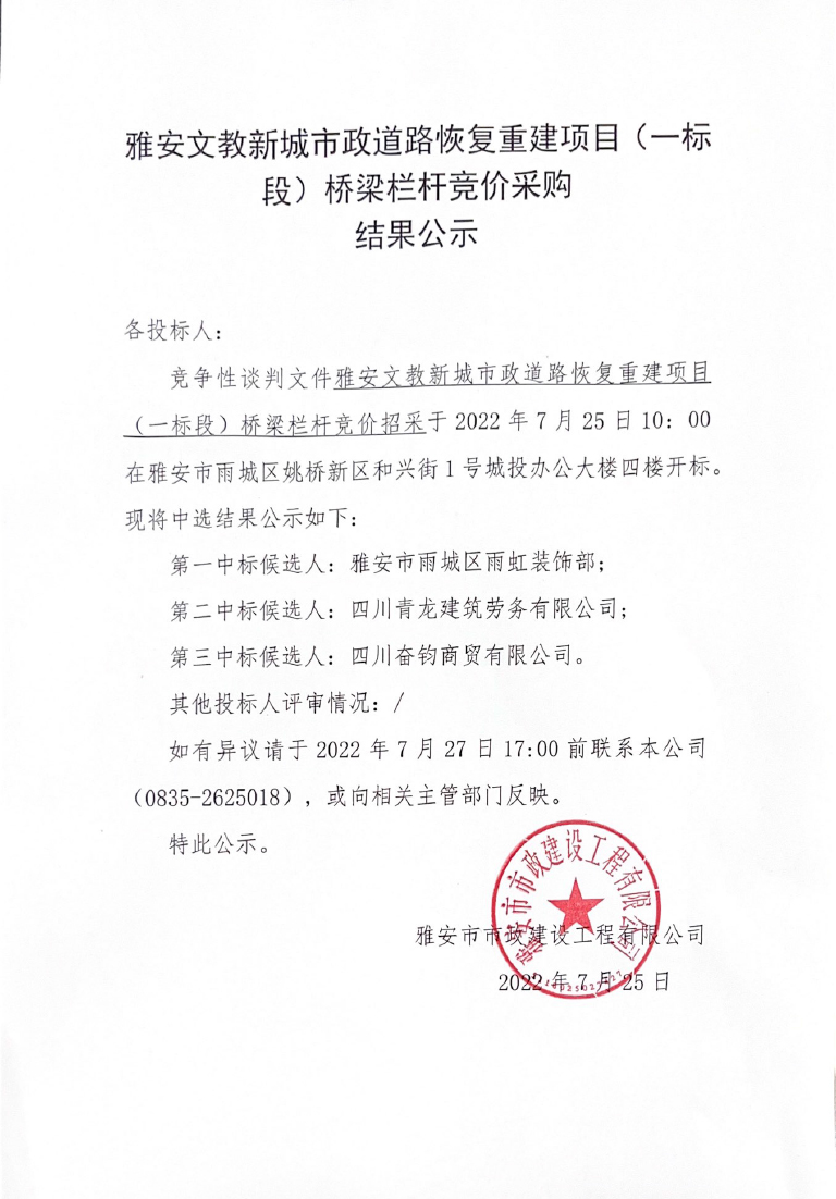 雅安文教新城市政道路恢復(fù) 重建項(xiàng)目競(jìng)價(jià)(一標(biāo)段)橋梁欄桿競(jìng)價(jià)采購結(jié)果公示