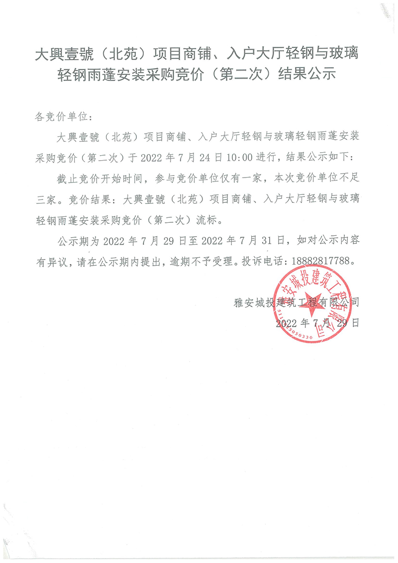 大興壹號(北苑)項(xiàng)目商鋪、入戶大廳輕鋼與玻璃輕鋼雨棚安裝采購競價(第二次)結(jié)果公示