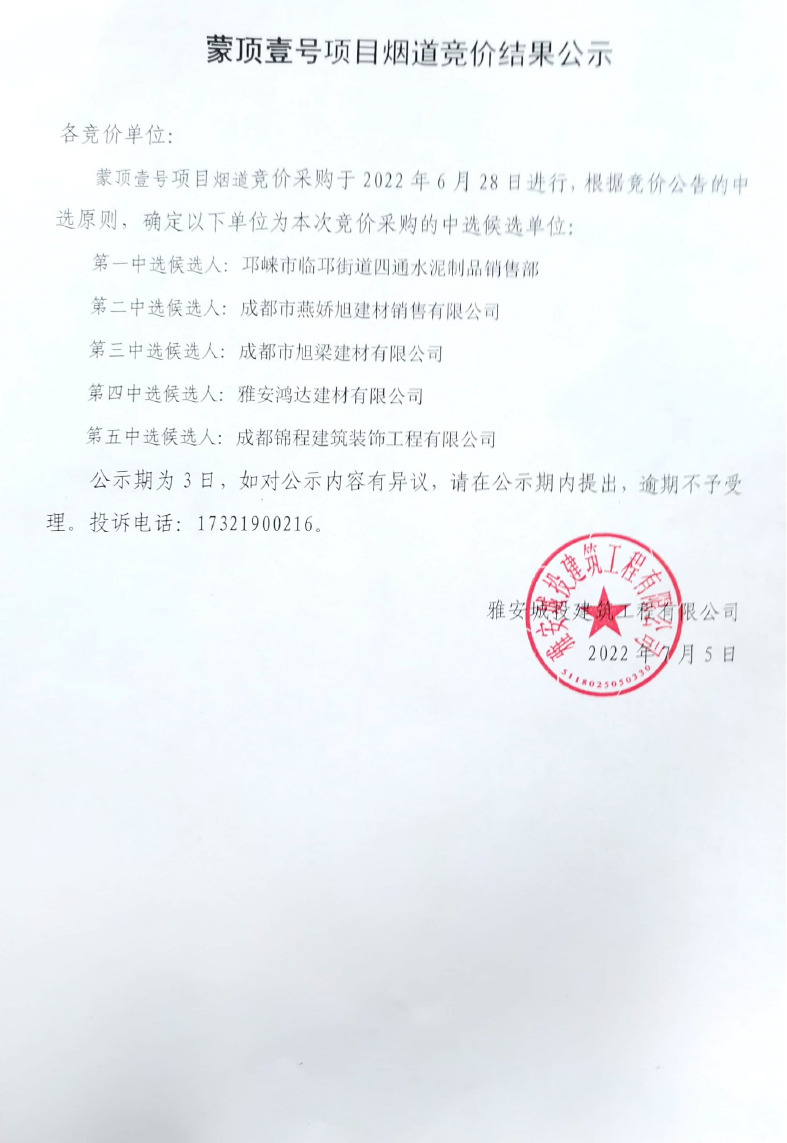 蒙頂壹號(hào)項(xiàng)目煙道采購競(jìng)價(jià)結(jié)果公示