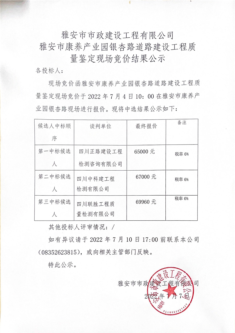 雅安市康養(yǎng)產(chǎn)業(yè)園銀杏路道路建設(shè)工程道路質(zhì)量鑒定現(xiàn)場競價公告