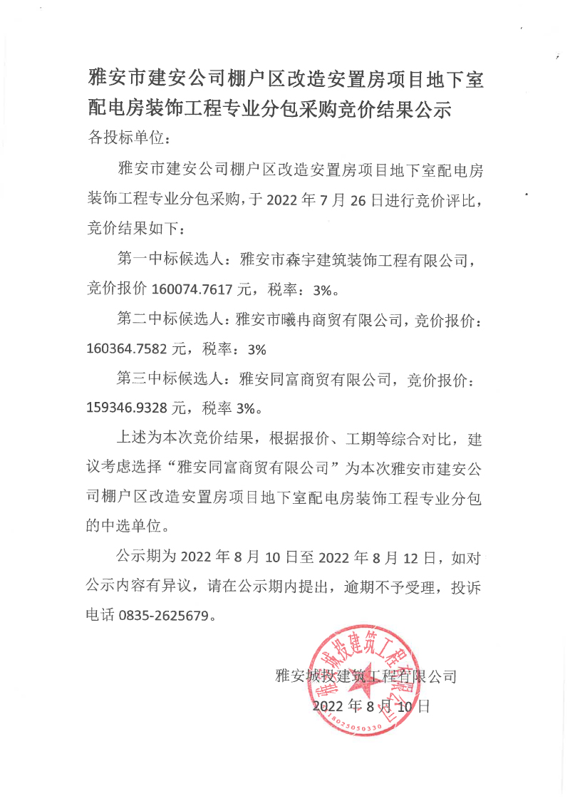 雅安市建安公司棚戶區(qū)改造安置房項(xiàng)目地下室配電房裝飾工程專業(yè)分包競(jìng)價(jià)結(jié)果公示